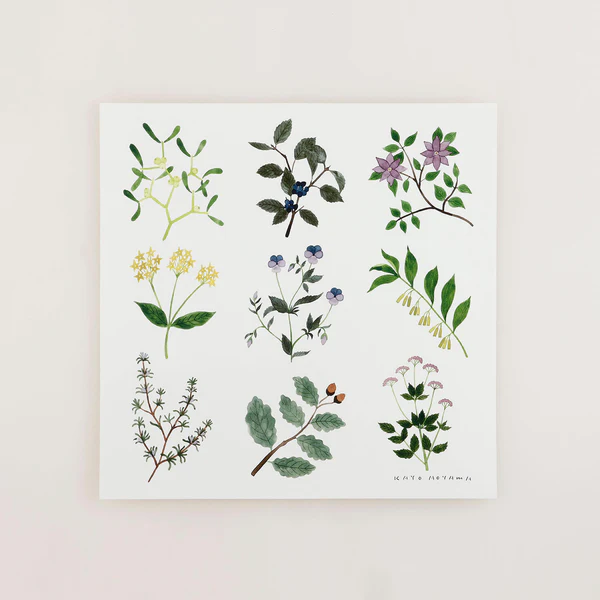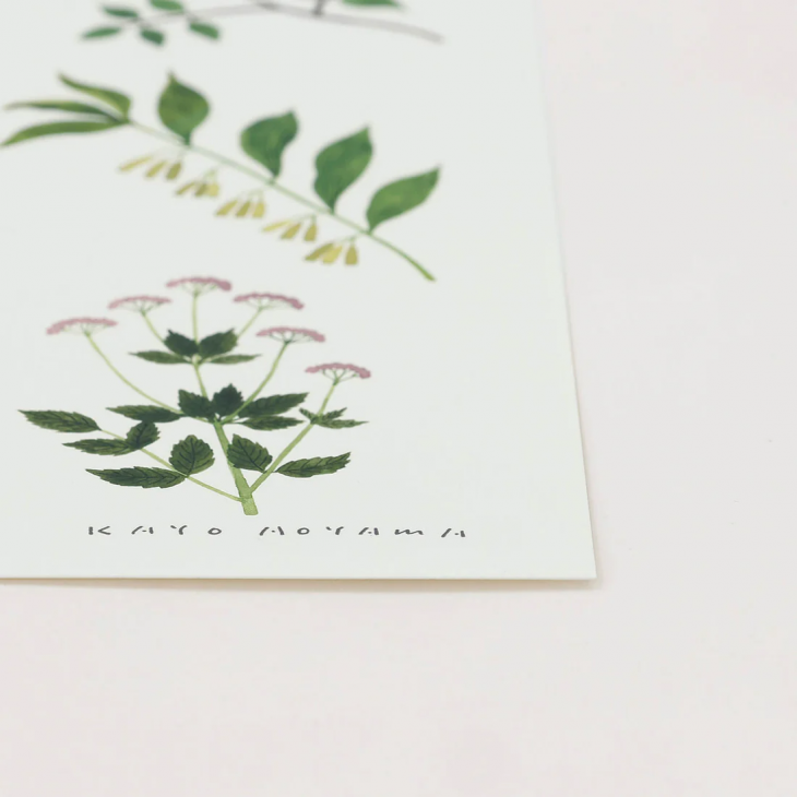 青山佳世さんによって絵の具で描かれたモチーフが均等に並んだ、まるで図鑑のようなシリーズ。「モチーフを選ぶ際、古いイギリスの植物図鑑を見ていたので少しマニアックな種類のものもあるのですが、描いてみたい造形の植物を選んで描きました」(青山さんのコメント)。モチーフは左上から右に「ヤドリギ」「クロウメモドキ」「クレマチス」、2段目「イケマ」「ビオラ」「アマドコロ」、3段目「ローズマリー」「オーク」「イワミツバ」。