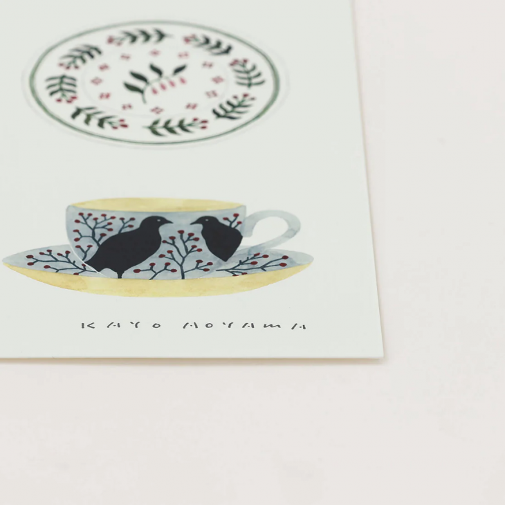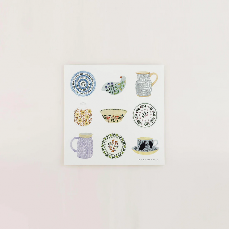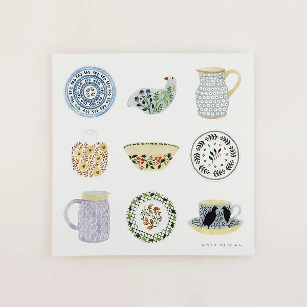 青山佳世さんによって絵の具で描かれたモチーフが均等に並んだ、まるで図鑑のようなシリーズ。「こんな陶器があったら素敵かな?と絵付けをするような感覚で描きました」(青山さんのコメント)。モチーフは左上から右に「お皿」「鳥の置物」「水差し」、2段目「花瓶」「ボウル」「お皿」、3段目「水差し」「お皿」「カップ&ソーサー」。