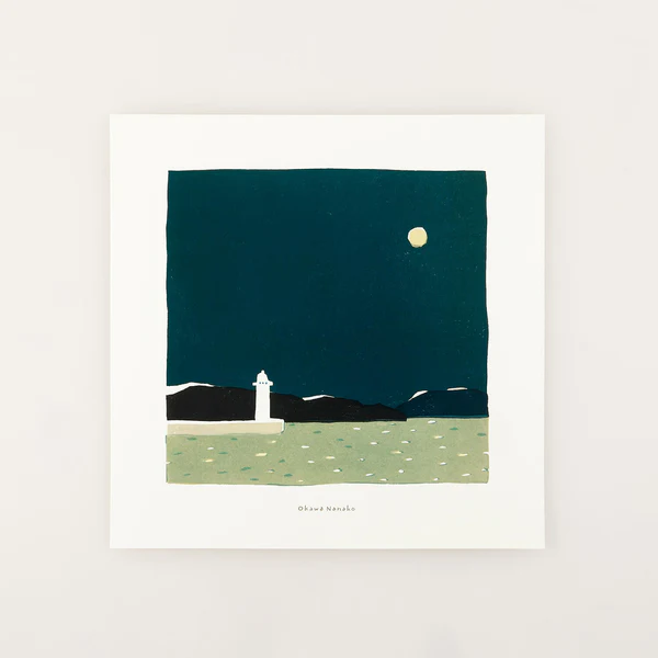 連なる山を背景に、消灯したままの灯台と青緑の空に鮮やかに輝く満月、海面に揺らぐ月明かり。全てが絶妙なバランスで配置されています。ご自身の心の中にある風景と重ね合わせてお愉しみください。大川菜々子さんの描き下ろし作品です。