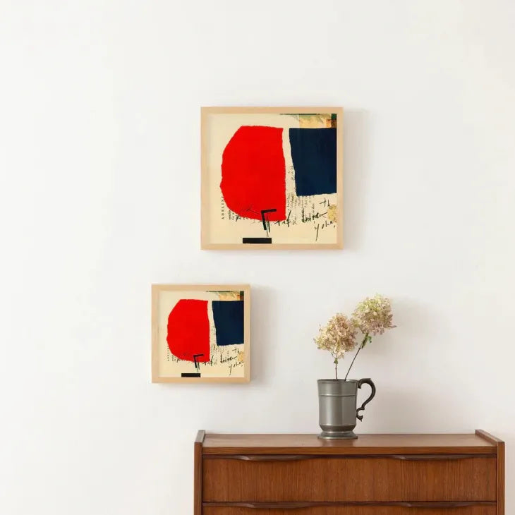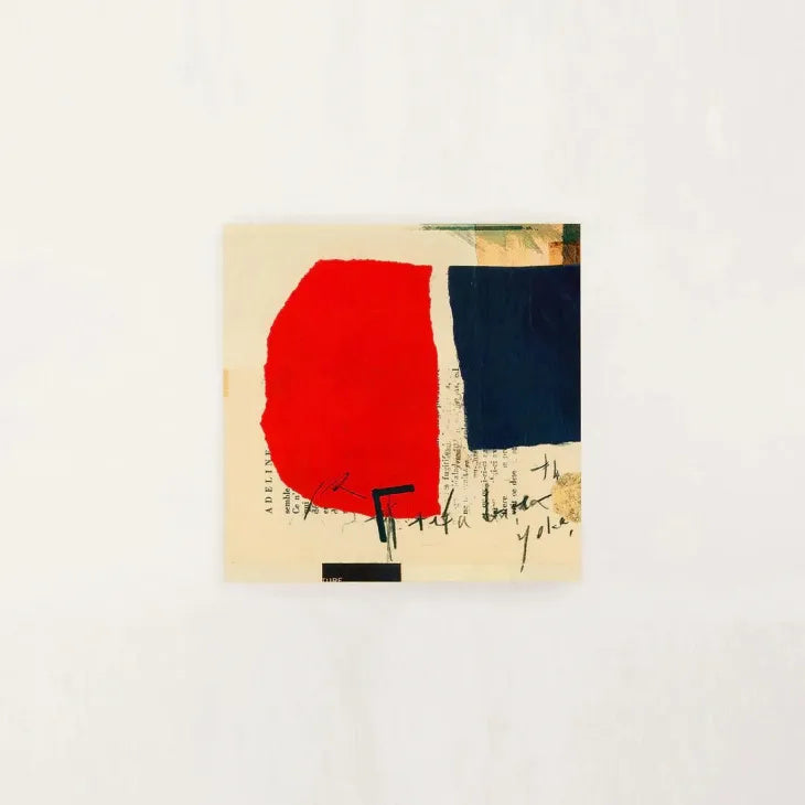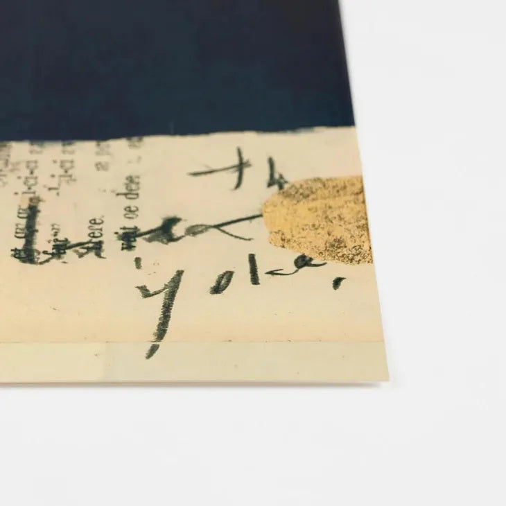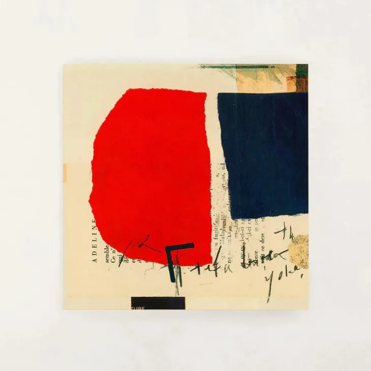 古書を思わせるページを土台に、鮮烈な赤と深みのある紺の色面が力強く対峙する、井上陽子さんによるコラージュ&ドローイングの融合作品です。「ADELINE」の文字や判読しきれない手書きの走り書き、右下の金色のテクスチャが重なり合い、時間の堆積を感じさせる独特の世界観を生み出しています。余白と密度の緊張感あるバランスが印象的な一枚です。