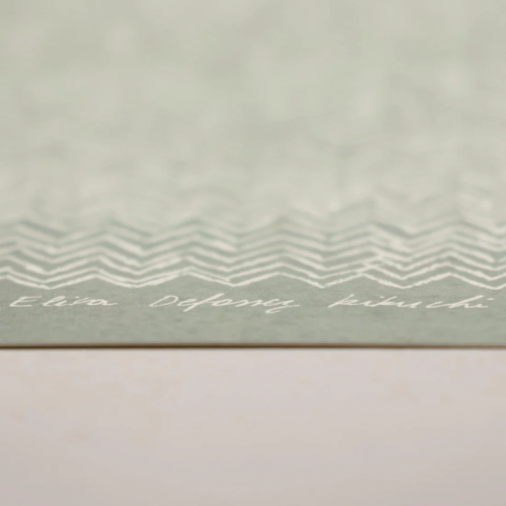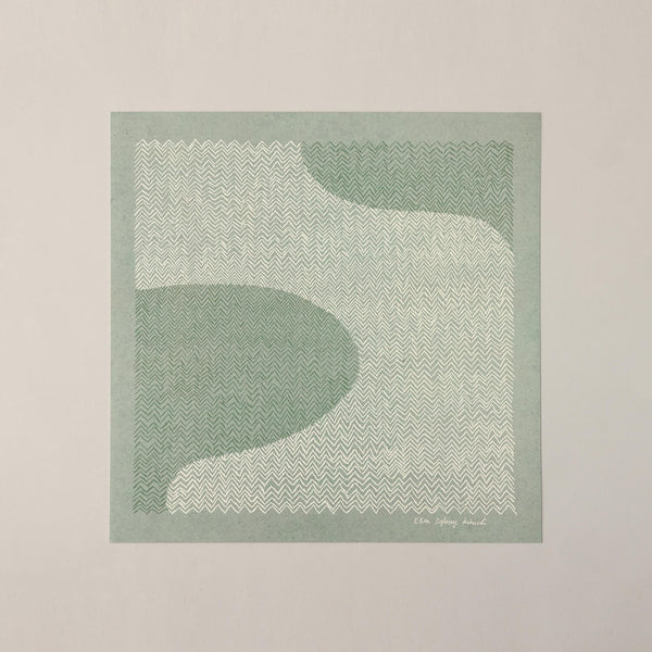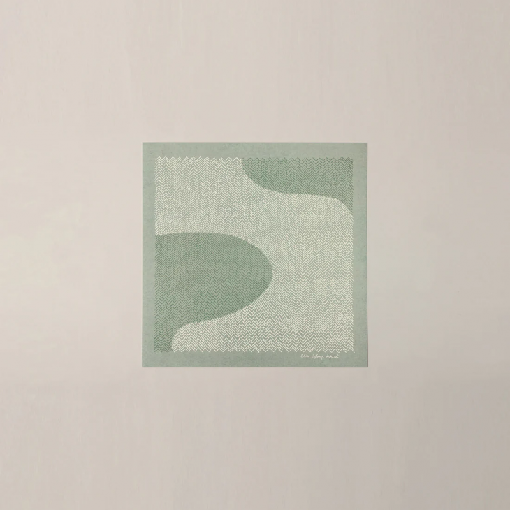フィンランド語で「フィンランド」を意味することば「suomi スオミ」と名付けられたこの作品は、フィンランドの風景をイメージしたものだそうです。フィンランドの風景と言えば主に湖と森。手書きのヘリンボーン織りのモチーフが、その美しい景色を表現しています。エリザデフォッセ・菊池さんの作品です。