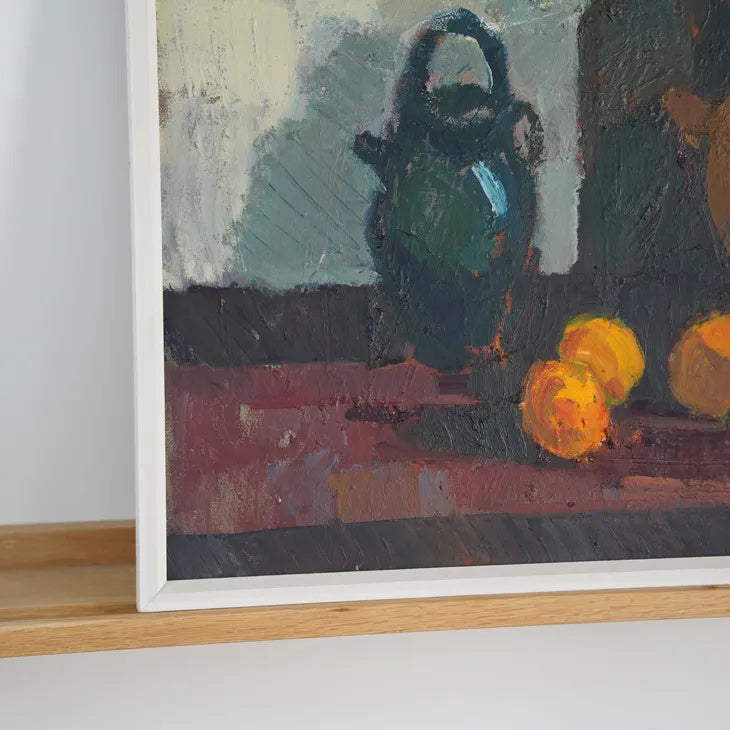 スウェーデンの画家、ベント・ヒルグルンドによる油彩。 暖かみのある色彩で描かれた心落ちつかせる静物画。