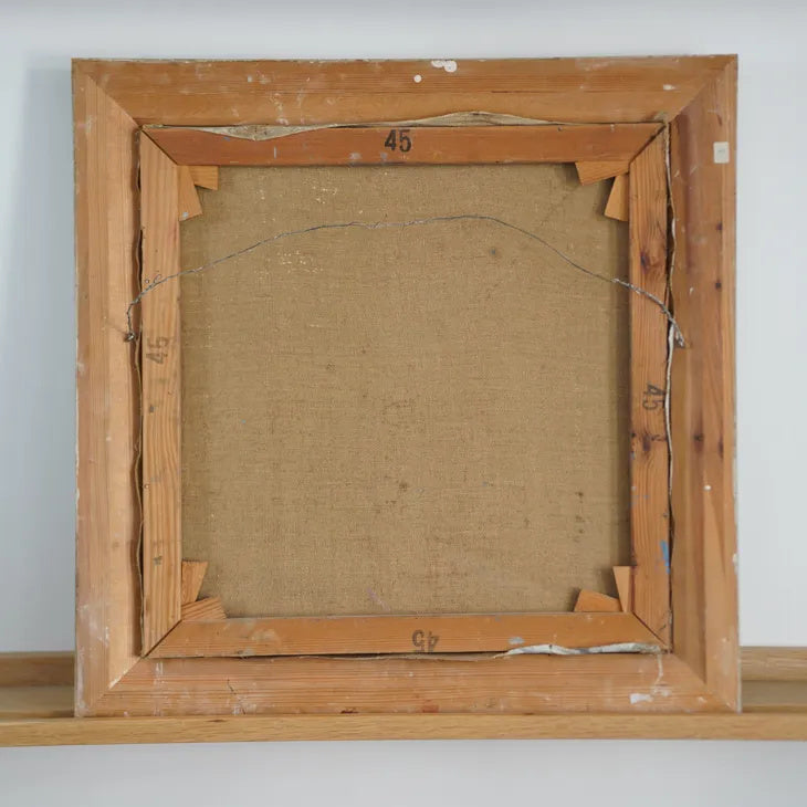 スウェーデンの画家(作者不詳)、による穏やかで独特なスウェーデン・ミッドセンチュリー抽象静物画。柔らかなパステルブルーとパテの色合いが織りなす、春らしい爽やかで可愛らしいパレットに、色とりどりの野花が咲き誇るティーカップと、その横に飾られた白樺の枝が描かれています。金箔押しの木製フレームに額装されており、すぐに飾ることができます。様々なインテリアシーンにマッチする作品です。